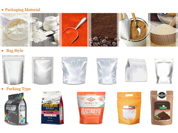 It is suitable for automatic packing for Powder: milk powder, coffee powder, food additives, condiments, tapioca powder, coconut powder, pesticide powder, fertilizer granules etc.
