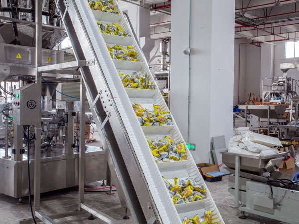 Hopper/Conveyor System This hopper and conveyor system reliably receives egg yolk pies from feeding stations and transports them to each of the eight stations without delay or disruption, offering adjustable speeds to suit various production requirements. |