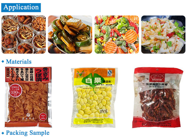 1. Any product that can pack in bag, such as fish, poultry, meat, grains and other food items. 2. Solid species: candy, peanut, green bean, pistachio, crystal candy, brown sugar, cookie, cake, daily commodities, cooked food, pickles, puffed food, etc. 3. Granule species: grain, refined monosodium glutamate, granular drug, capsule, seed, condiment, granulated sugar, chicken essence, melon seeds, nuts, pesticide, fertilizer, feed etc. 4. Liquid species: detergent, fruit juice, miller wine, soy sauce, vinegar, drinks etc. 5. Thick liquid species: chilli sauce, tomato sauce, peanut butter, jam, bean sauce etc.