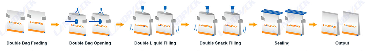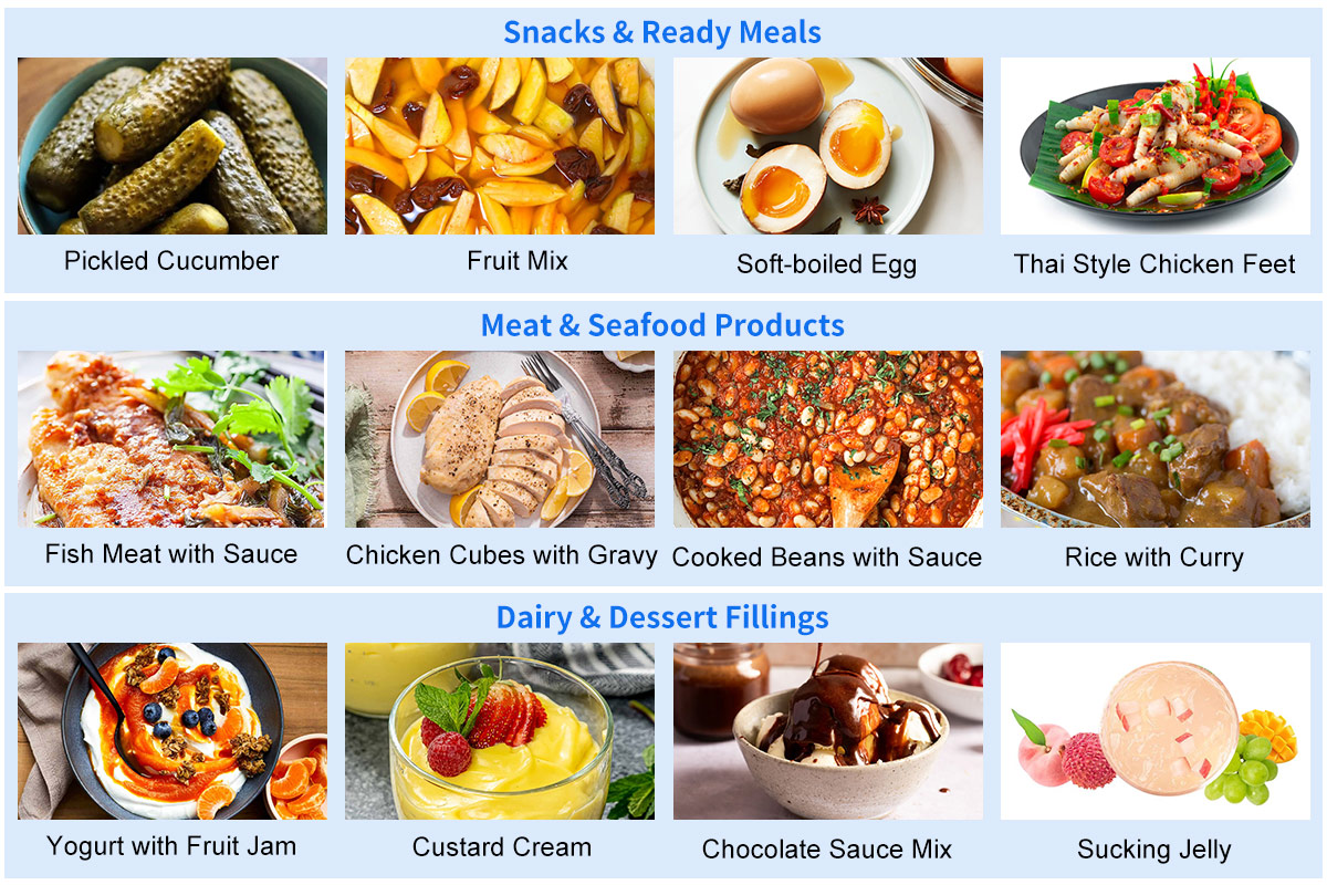 Dual Filling Systems for Snacks & Sauces This model can be equipped with two customized filling systems—one for dry snacks or granules, and the other for sauces, pastes, or liquids. |