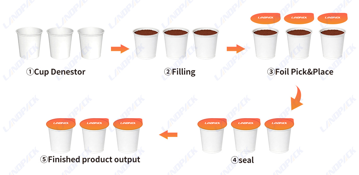 1. Cup feeding  → Product Filling → Foil picking and placing → Heat sealing → Cup discharge → Finished product output