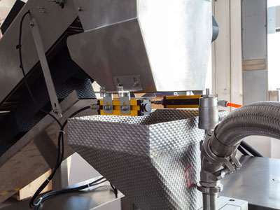 Clean Tray Feeder design with Syrup Collection. A baffle is placed under the tray feeder in order to store syrup leftover from fruit to keep the machine clean and ensuring a clean work environment. |