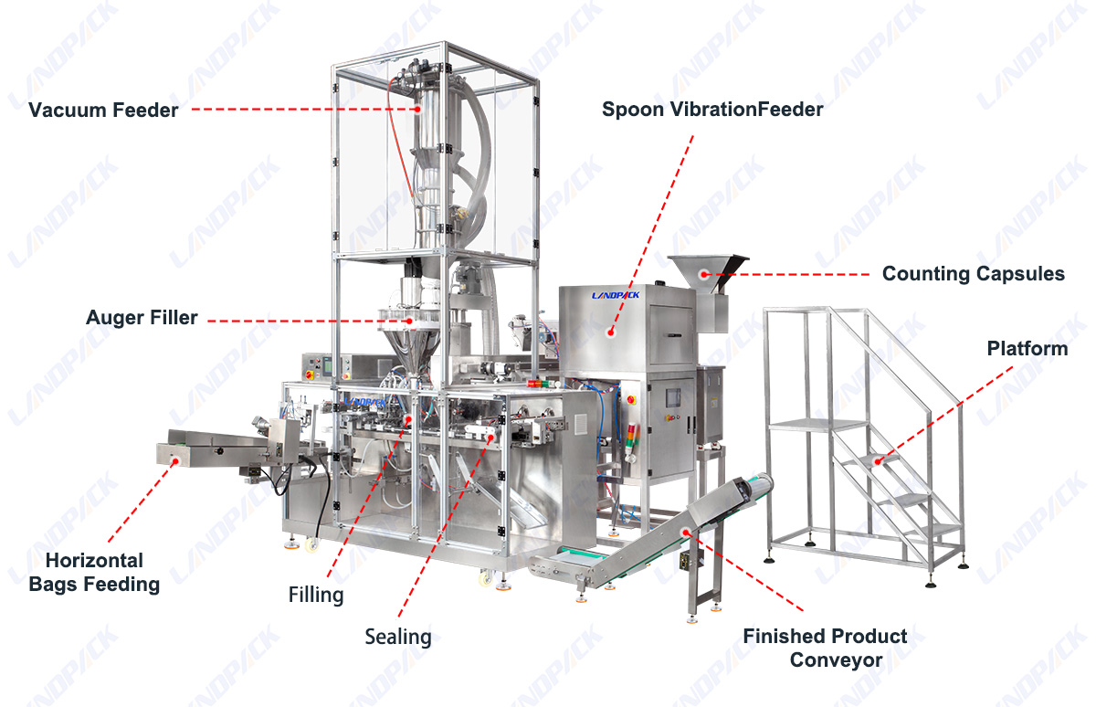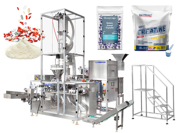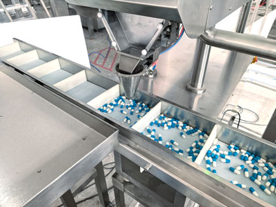 Dual Filling System for Capsules + Powder: With an eight-channel counting machine as well as a separate powder dosing device The system allows simultaneous filling of tablets and capsules as well as powders that are fine into one pouch. |