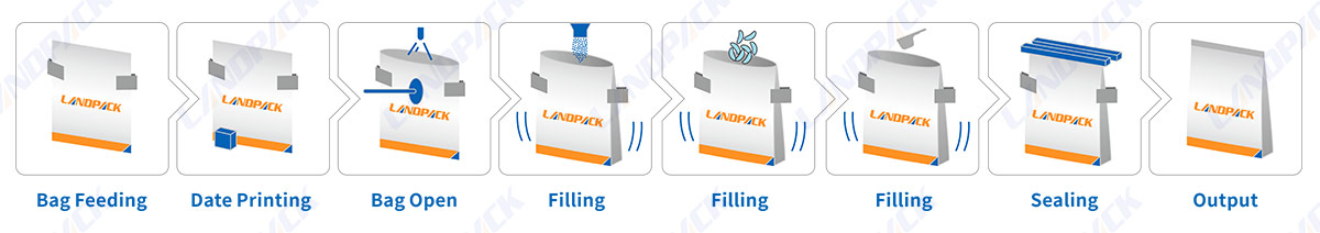 | Work Flow | 1. Giving bag, 2. Pick up the bag(coding), 3. Open the bag up and down, 4. Filling, 5. Heating sealing, 6. Output of product | |||