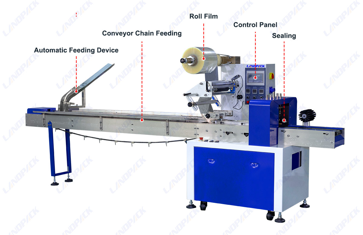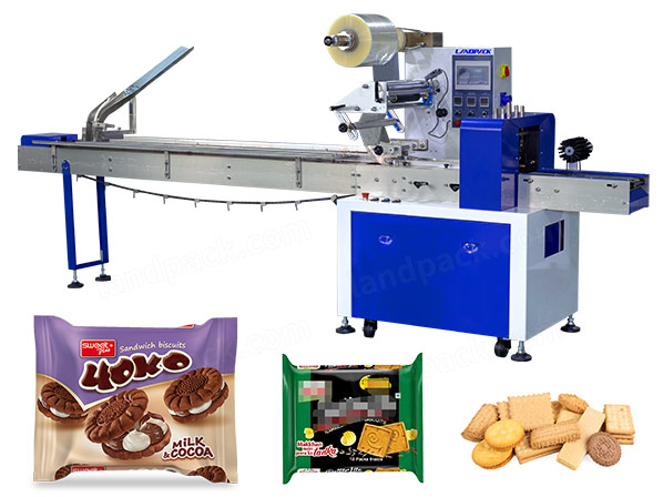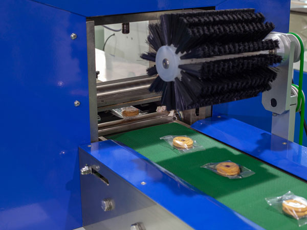 Product Feeding Conveyor Equipped with lugs and pushers, the conveyor is able to move cookies, biscuits or snacks into the film tube in a uniform spacing. The synchronized movement makes sure that every product is properly placed to avoid gaps or overlaps. |