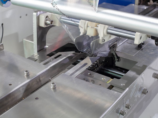 Transverse Sealing and Cutting System The jaws of the transverse sealing move in tandem with the flow of the film to form two seals on the sides for each bag. While at the same time the integrated cutter is able to separate bags from the continuous film tube. |